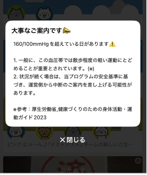 最高血圧160mmHg または最低血圧100mmHg以上の値を、みんチャレアプリへ入力された場合