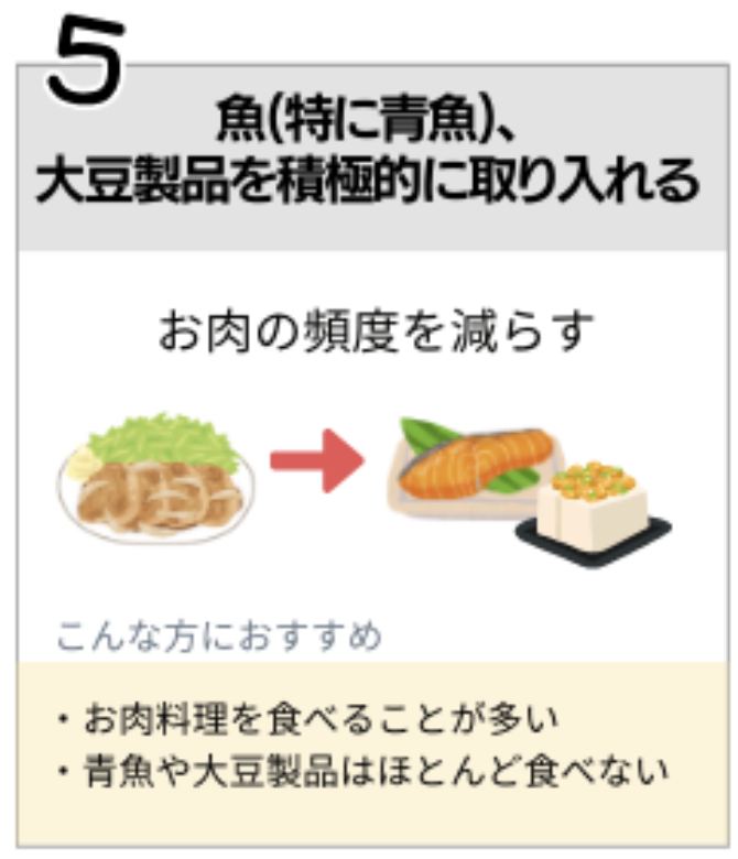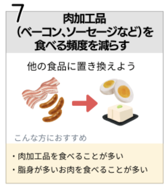 「肉加工品を食べる頻度を減らす」から、「魚大豆製品を積極的に取り入れる」に変更したい